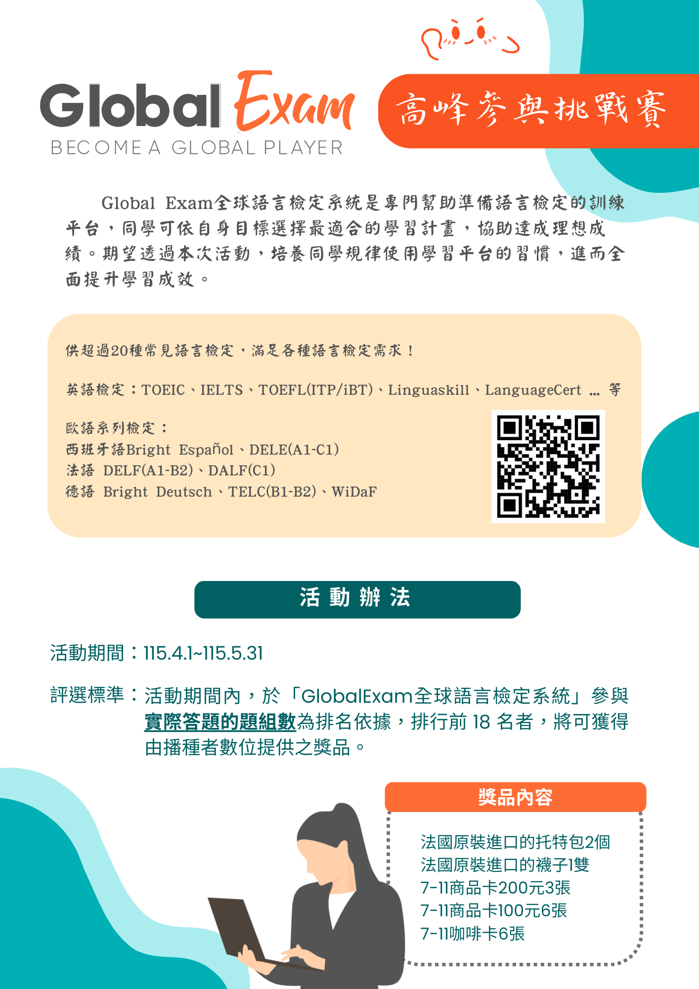 活動內容:活動期間內,於「Global Exam全球語言檢定系統」參與實際答題題組數為排名依據,排行前18名者,將可獲得由播種者數位提供之獎品。